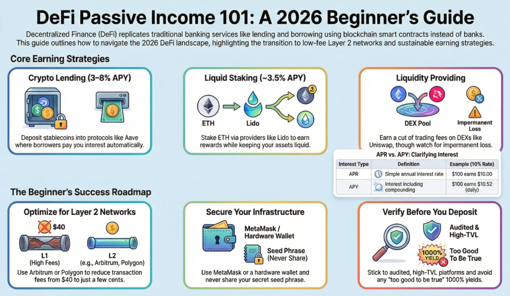 Crypto Lending is probably the simplest way to start. You deposit your crypto into a lending protocol like Aave or Compound, and borrowers pay interest to use it. The platform handles everything automatically through smart contracts. Current rates for stablecoins like USDC or DAI hover around 3-8% APY depending on market conditions. Not life-changing, but way better than my Chase savings account.
